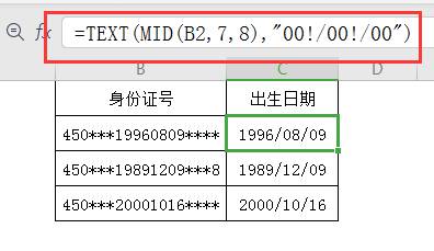 3、ID列中输入公式= TEXT(MID(B2,7,8),“ 0000-00-00”)。