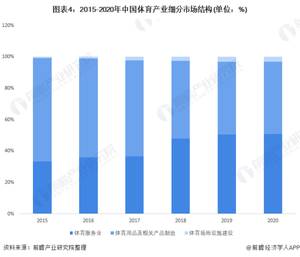 从细分市场结构来看,过去体育用品一直是我国体育产业最大的类别,2015年占比超过60%,是体育产业的主要支撑,但随着全民健身意识的增强和体育消费的不断增长,包括体育赛事运营、场馆运营、体育培训等类别的体育服务业发展势头良好,初步统计2020年体育服务占比已达50%,超过体育用品成为体育产业占比最大的细分领域。