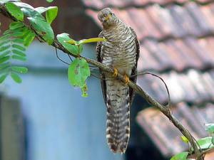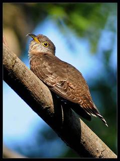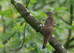 四声杜鹃(学名:Cuculus micropterus):是中型鸟类,体长31-34厘米。头顶和后颈暗灰色;头侧浅灰,眼先、颏、喉和上胸等色更浅 ;上体余部和两翅表面深褐色 ;尾与背同色,但近端处具一道宽黑斑。下体自下胸以后均白,杂以黑色横斑;翅形尖长;尾具宽阔的近端黑斑,翅缘白而无斑;下体横斑较粗,达3-4毫米宽,且较疏,斑距超过5 毫米。