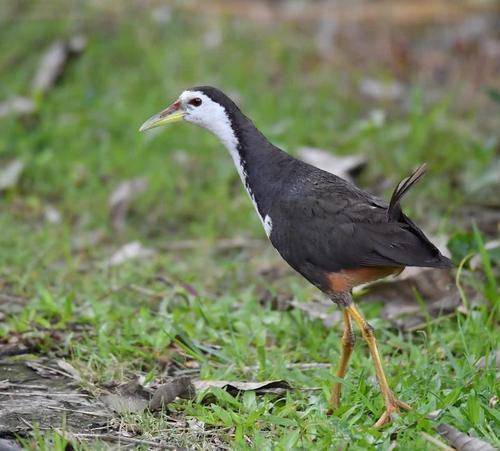 白面水鸡学名:白胸苦恶鸟(Amaurornis phoenicurus)属于鹤形目秧鸡科的鸟类,共有4个亚种。嘴基稍隆起,但不形成额甲,嘴峰较趾骨为短;跗骨较中趾(连爪)为短;翅短圆,不善长距离飞行。善奔走,在芦苇或水草丛中潜行,亦稍能游泳,偶作短距离飞翔,以昆虫、小型水生动物以及植物种子为食。在繁殖期间雄鸟晨昏激烈鸣叫,音似“kue,kue,kue”,故称“姑恶鸟”或“苦恶鸟”。在荆棘或密草丛中,偶亦能在树上,以细枝、水草和竹叶等编成简陋的盘状巢。