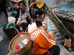 沱江上面有很多桥,有大的凤凰一桥、二桥,也有小的木质桥,还有类似于梅花桩的立柱桥。从桥上走过,也能感受到沱江水日夜流淌带来的“逝者如斯夫的感叹”和美好的想像。沱江水养育了善良的凤凰人,湘西人。在这里,人们自食其力,就连老人和小朋友也都出来找点差事。在沱江的边上,就遇到了捡矿泉水瓶的祖孙。为环保贡献一份力量的同时,也给自己的生活多了一份来源。