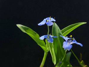 鸭跖草叶形为披针形至卵状披针形,叶序为互生,茎为匍匐茎,花朵为聚花序,顶生或腋生,雌雄同株,花瓣上面两瓣为蓝色,下面一瓣为白色,花苞呈佛焰苞状,绿色,雄蕊有6枚。[1]