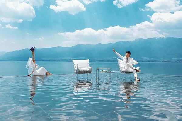 相较于苍山的震撼,洱海会显得柔和一些,但它处处都是好风景。你可以选择在洱海边拍照,也可以选择在岸边的石头上、水中,这些景色能够呈现出来的美和甜蜜,是加倍的。