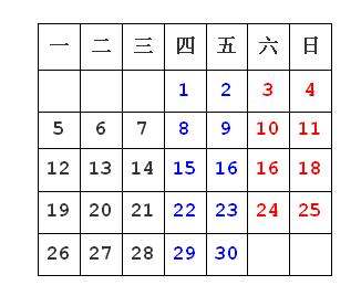 11月份正好共有30天,所以这年的11月1日是星期四,12月1日就是星期六.