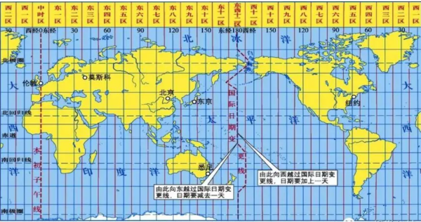 随地球自转,一天中太阳东升西落,太阳经过某地天空的最高点时为此地的地方时 12点,因此,不同经线上具有不同的地方时。同一时区内所用的同一时间是区时(本区中央经线上的地方时),全世界所用的同一时间是世界时(0度经线的地方时)。区时经度每 15 度差一小时,地方时经度每1 度差 4 分钟。
