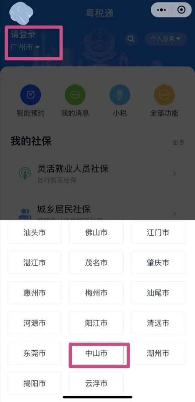 1微信搜索“粤税通”小程序,左上角选择所在城市,点击“登录”,提示点击“确定”。