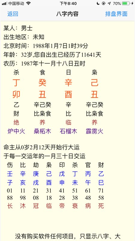 五行八字分析结果 生日(公历): 1992年 1月 2日 1时0分 生日(农历): 辛未年 十一月 廿八 丑时 八 字: 辛未 庚子 丁丑 辛丑 五 行: 金土 金水 火土 金土 纳 音: 路旁土 壁上土 洞下水 壁上土 五行分析: 总述:八字偏弱,八字喜「木」,起名最好用五行属性为「木」的字。分析如下: 此命五行土旺;五行缺木;日主天干为火 (同类为:火木;异类为:金水土。五行统计: 0木, 1火, 3土, 3金, 1水) 用神分析:〖同类得分〗:火1.30,木0.24,共计1.54分;〖异类得分〗:金3.40,水1.92,土1.50,共计6.82分;〖差〗:-5.28分;〖综合旺衰得分〗:农历1991年11月21日出生的男