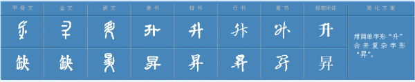 由于“升”引申出了“上升”的意义。秦以后的俗字,太阳升的“升”,便多加“日”头作“升”,以“日”表意、以“升”表音。又造“升”,也与“升”同,是“上”“登”的意思;但唐朝以后,一般只用于升官,把“升官”写作“升官”。