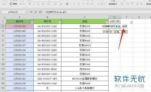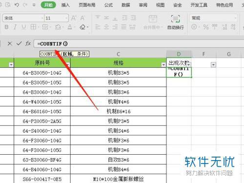 3. 之后在函数栏中将函数【=COUNTIF()】输入到输入栏中,如图。