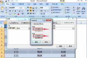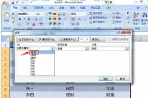 3、这时,会弹出“排序”窗口,在列的主要关键字中选择“姓名”,“排序依据”和“次序”执行默认选项即可。