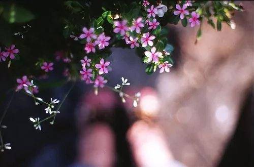长春花经常被用作道路城市绿化,其中一个原因大概是因为长得好看,看它的花儿,五片花瓣围绕着中间那一点深色,如众星环月,远看又如粉色的小星星,正在一闪一闪,悄悄对着你说话。