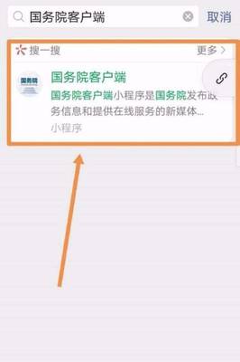 1、直接在搜索页里面,找到国务院客户端小程序并选择进行跳转。