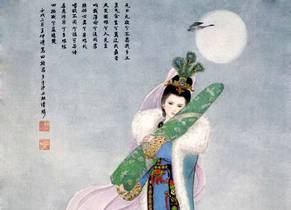 【隔尾】恁的般长门前抱怨的宫娥旧,怎知我西宫下偏心儿梦境熟。爱他晚妆罢,描不成,画不就,尚对菱花自羞。(做到旦背后看科)(唱)我来到这妆台背后,元来广寒殿嫦娥,在这月明里有。