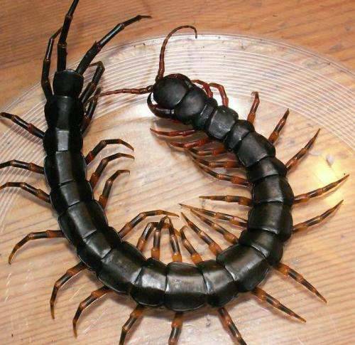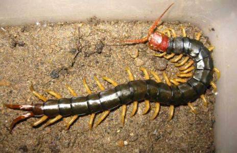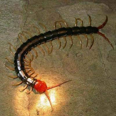 蜈蚣为陆生节肢动物,身体由许多体节组成,每一节上均长有步足,故为多足生物。蜈蚣又名叫天龙、百脚虫、少棘蜈蚣、吴公、蝍蛆等,是一种有毒腺的、掠食性的陆生节肢动物。常见的蜈蚣有红头、青头、黑头三种。红头的背部呈红黑色,腹部现淡红色,足为淡橘红色或黄色。青头的背部和足部呈蓝色,腹部淡蓝色,体型小,长度约为红头蜈蚣的二分之一。