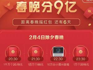 2月4日除夕央视春晚20:30,通过百度APP摇一摇送出1千万个20.19元;