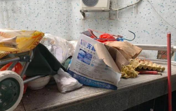 (吴阿姨家的阳台确实有很多垃圾杂物及食物残渣)