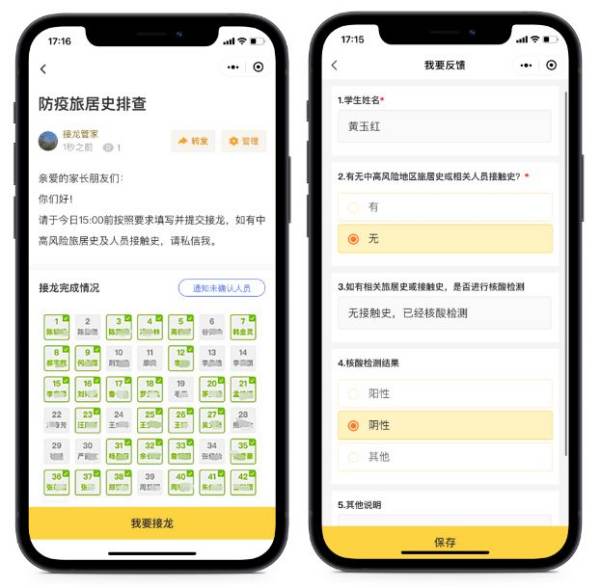 建议大家使用专门的小程序,接龙管家小程序,可以一次发布,每天自动收集健康码截图“名单”功能可以将群员反馈情况可视化。老师可提前录入名单(学号),学生反馈后姓名会进行颜色标记,老师根据名单准确获知接龙完成情况。