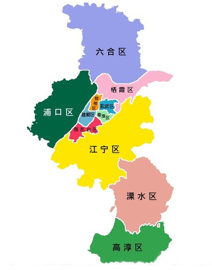 玄武区、秦淮区、鼓楼区、建邺区、雨花台区、栖霞区、浦口区、六合区、江宁区、溧水区、高淳区。