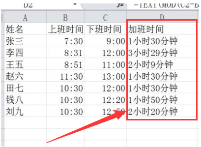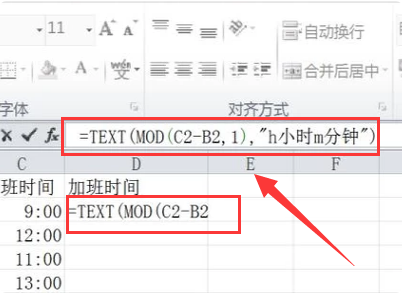 6、根据上面的步骤,在“加班时间”这一列的对应方,如图所示,输入函数“=TEXT(MOD(C2-B2,1),"h小时m分钟")”,然后点击回车键,显示D2内容。