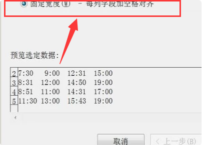 4、在文本分列向导中,适当调整列表的位置,使得每一个时间点都分隔开,接着点“下一步”按钮。
