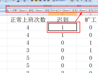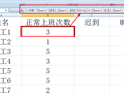 3、=SUM((Sheet1!$B$2:Sheet1!$B$1500=A11)*(Sheet1!$C$2:Sheet1!$C$1500>="上班")),正常上班次数:输入员工姓名——选择B2单元格——输入公式以上公式,并同时按下ctrl+shift+回车键。