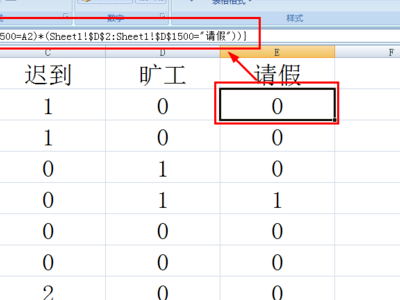 5、统计请假次数:在F2输入公式:=SUM((Sheet1!$B$2:Sheet1!$B$1500=A2)*(Sheet1!$D$2:Sheet1!$D$1500="请假"))——ctrl+shift+回车键——向下填充公式,就完成了。