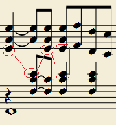 遇到这种情况时,应该把所有乐谱上的音都奏出来,有关的手指不必弹满时值,而借助延音踏板来使音符的时值保持下去。当两只手同时弹奏同一音时,可以两个手指一起弹这个音,也可以只用其中一个手指弹这个音。实际的演奏如下图所示: