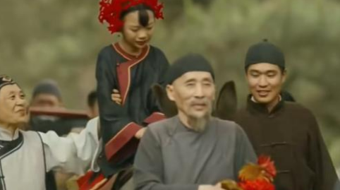 此时的镜头给了一只公鸡,这只公鸡被送亲人抱在手上,头顶着火红的鸡冠,戴着红花,这只公鸡是新郎官。封建旧俗中,新郎官长期不归家或逝世的,在举行婚配时会用一只公鸡代替。女子便和这只公鸡拜堂,寓意“嫁鸡随鸡。嫁狗随狗”,从此女子便要三从四德、从一而终,不得改嫁。