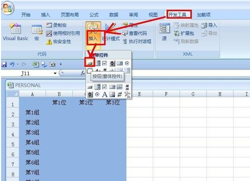 5.回到EXCEL工作表中,单击“开发工具”——插入——按钮,拖动十字箭头画出一个矩形按钮,弹出“指定宏”对话框,选择宏名“Sheet5.福彩号码”,单击确定。