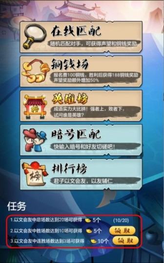 按日计,三连胜可得10元宝奖励,累积胜10场以及共完成20场可各得5个元宝奖励。