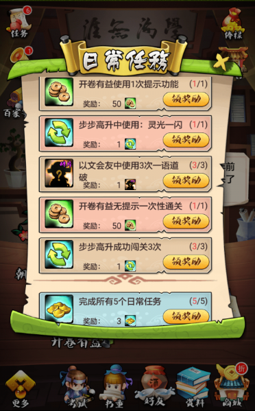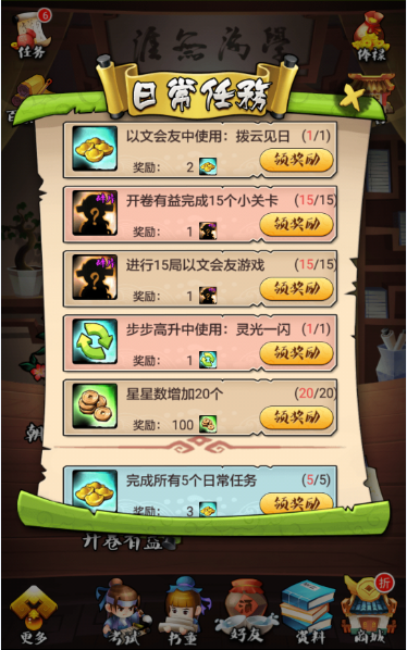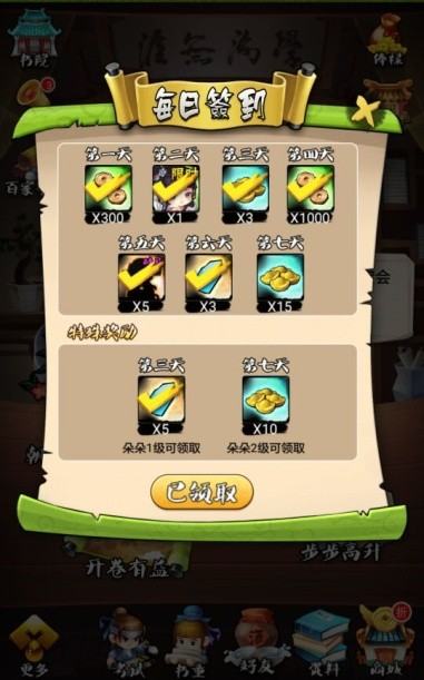 每个书童有不同技能,如朵朵的签到可以获得元宝、书童碎片等,张飞的扬威可以在以文会友结束后随机增加声望数,沈万三的生财可以在领取俸禄的时候随机增加铜钱数,有针对性地收集书童并进行升级,可以快速地积累财富报考功名。