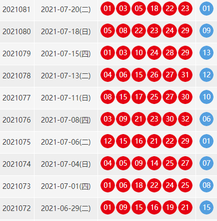 1、2021081-2021072期(期号/开奖日期/中将号码)