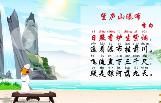 香炉峰在阳光的照射下生起紫色烟霞,远远望见瀑布似白色绢绸悬挂在山前。高崖上飞腾直落的瀑布好像有几千尺,让人恍惚以为银河从天上泻落到人间。