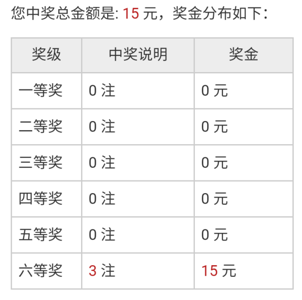 大乐透前区中了3个号属于九等奖,有5元钱的奖金。 根据《中国体育彩票超级大乐透游戏规则》第二十七条超级大乐透根据投注号码与开奖号码相符情况确定相应中奖资格。具体规定如下: 一等奖:投注号码与当期开奖号码全部相同(顺序不限,下同),即中奖; 二等奖:投注号码与当期开奖号码中的五个前区号码及任意一个后区号码相同,即中奖; 三等奖:投注号码与当期开奖号码中的五个前区号码相同,即中奖; 四等奖:投注号码与当期开奖号码中的任意四个前区号码及两个后区号码相同,即中奖; 五等奖:投注号码与当期开奖号码中的任意四个前区号码及任意一个后区号码相同,即中奖; 六等奖:投注号码与当期开奖号码中的任意三个前区号码及两大乐透买的6+3追加中3+0是多少钱