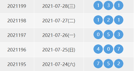 2021年7月28号(2021199期)的福利彩票3D的开奖号为1、3、1。