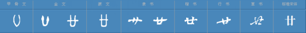 白话版《说文解字》:廿,两个“十”相合并。“廿”的古文有所省略,字形有如下图: