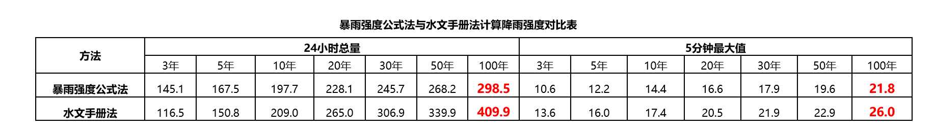 以北京为例,用水文手册和暴雨公式进行计算后可以得到下图中表格里的结果(24h降雨总量以及5min最大降雨量),两者结果具有一定差异,源于数据以及方法的差异,可根据情况选择,水文手册法适用于大面积,暴雨公式适用于小面积。