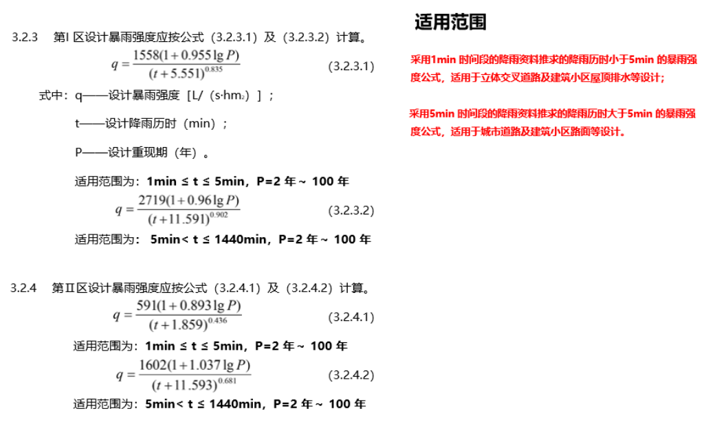 通过两个方法可以知道,第一个是参考当地的水文手册用Pearson—III分布进行计算(可以参考相关文献),第二个是参考当地的暴雨公式(在《城镇雨水系统规划设计暴雨径流计算标准》中可以找到,如下图)。