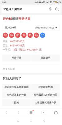 第2020009期双色球开奖结果中奖号码为08、06、14、19、26、03和蓝色球12,本期开奖日期为2020年01月21号,本期销售金额为405733380元,下期一等奖奖池累计金额为645107708元。