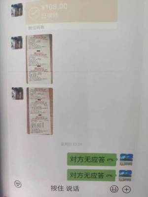 可以清楚的看到覃某发出的彩票信息和阿丽的108元付款,最后阿丽连续打电话也没人接。