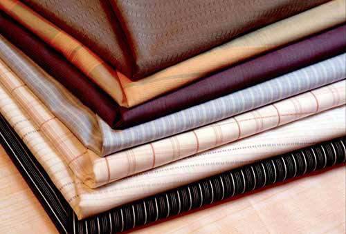 服装面料有棉布、麻布、丝绸、呢绒、皮革、化纤、混纺、色织布。