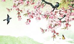 译文:桃红柳绿的春山,煦暖的阳光照耀,和柔的东风吹拂,楼阁上高卷起帘拢,倚栏干远望。杨柳垂条,秋千轻晃,院子里静悄悄。院外黄莺啼鸣,春燕飞舞; 小桥之下流水飘满落红。