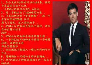 李小龙能一拳把钢盔打陷下去, 他的手指用棒球棍打也不会有疼痛感, 他的垫步侧踢力量达1200斤,至今无人能破, 他的肌肉素质堪称世界之最,拥有强大的爆发力, 李小龙能够进行连续踢击,并且击击强劲有力,美国专家说,凭借他的这一绝技就可以无人能敌。 关于李小龙的资料美国有专家进行专门编写,有些你可以自己亲自感受得到,像猛龙过江,李小龙背后的肌肉展开就像小型的翅膀一样,他的侧踢把带护具的人踢飞,这些都是真材实料,没有特技渲染。 李小龙特别注重肌肉训练,但也是内功行家,因为他的绝招几乎都和寸劲有关,而寸劲都是内劲。 所以说,李小龙有世界纪录,吴京没有,吴京想破可以试试,不过如果他能破估计早就破了。很多李小龙、成龙、李连杰、甄子丹、吴京,谁的功夫更厉害?
