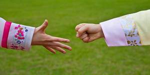 “猜拳”,俗称“十五、二十”,游戏规则十分简单,两人相对同时伸手出指(双手能出的数字为0、5、10),口中报一数字(即二人出拳数字之和0、5、10、15、20),与双方伸指数目之和相同者胜,输的人罚喝酒,两人相同就继续。