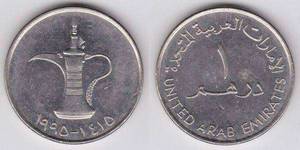 这是阿联酋的流通硬币,面额1迪拉姆。硬币上面的图案是壶子,“UnitedArabEmirates”是英语“阿拉伯联合酋长国(简称阿联酋)”的意思。