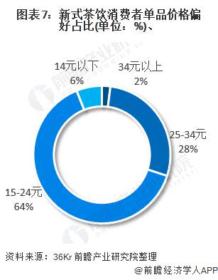 从消费群体的年龄结构来看,新式现制茶饮的消费者以年轻人为主,其中90后消费者在新式现制茶饮消费人群中所占的比重达50%,80后占比为37%。根据调研数据,15-24元是受众群体最多的单品价格区间,占比64%;而单价25元以上区间的受众人群也占到了30%。