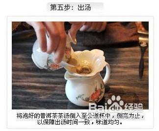 1、取适当量的普洱茶,将水烧开至90度~100度。先烫盖碗(或茶壶),将水倒掉之后将适量的普洱茶放入杯中盖碗(或茶壶)中,茶叶和水比例一般是1:20~30。注水之后等待20秒后出汤,一道是醒茶(洗茶)。将醒茶水倒掉之后可闻杯香。(生茶洗一次,熟茶需要洗两次)第二道注水完后等待大概10秒左右出汤,分茶之后就即可饮用。第三道注水之后不用盖住盖碗,可以快点出汤,之后几道出汤时间可根据上一道茶的的浓淡进行调整。 2、泡新制成的普洱茶建议使用95°左右的水温进行冲泡,大部分是芽头的嫩茶可以适当的降低温度,使用85°~92°的水进行冲泡。老茶就需要使用100°的水进行冲泡才能把香气滋味泡出来。普洱茶怎么泡?