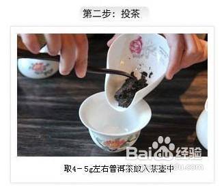 3、赏茶:拿起茶荷,把即将要冲泡的普洱茶,示以宾客。