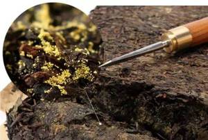 黑茶金茶用肉眼看到的是黄色的小点,年份久的话就变成白色的了。