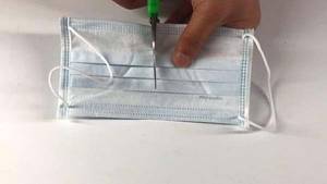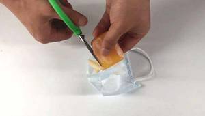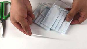 1.首先我们把一次性口罩对半剪。取出里面的钢丝。